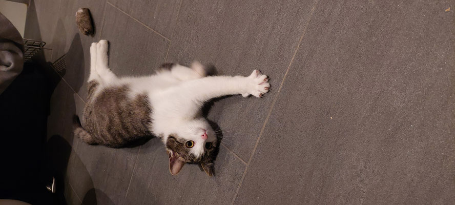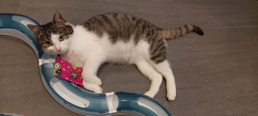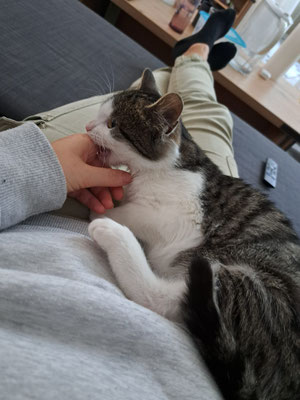 Diese kleine Persönlichkeit wurde am 09.11.2022 nach einer Meldung über Facebook in Georgsmarienhütte gesichert. Wie sie dahin kam ist nicht ganz geklärt. Sie muss wohl mindestens bereits ein paar Tage vor Ort gewesen sein. Anfangs noch fauchig, hat die kleine Maus inzwischen alle Unsicherheit abgelegt und lässt sich gern streicheln. Anderen Katzen gegenüber war sie noch ein bisschen frech und ein bißchen ist sie noch in der Lernphase wie man sich richtig verhält, aber sie macht sich inzwischen ganz toll und kommt auch in der großen Gruppe gut zurecht. Sie braucht auf jeden Fall altersgerechte Gesellschaft, die etwas mehr ihr entspricht, als die ausgewachsenen Katzen auf der Pflegestelle. Typisch für Kitten in ihrem Alter möchte sie natürlich toben, spielen und fangen spielen, wozu die Älteren meist weniger Lust haben.